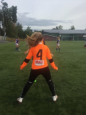 Matilda, kapten och målvakt i första och mittback i andra. Trygg i sitt spel. Startar igång spelet kort ömsom långt som MV. Samarbetar med Lova mycket fint i andra.
